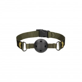 Le Bâillon Respirant Army Theme Ouch! dispose d'une boule trouée d'un diamètre de 4,4 cm fabriquée en plastique ABS et d'une sangle réglable en nylon et métal. Un produit confortable et robuste pour vos soirées au garde à vous !