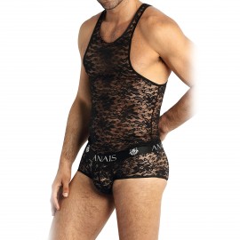 Au cœur de ce débardeur réside son design innovant, où chaque détail a été soigneusement étudié pour mettre en valeur la silhouette masculine. La dentelle noire, choisie pour sa finesse et son motif fleuri, enveloppe élégamment le corps, offrant un jeu de transparence qui allie subtilement séduction et élégance. Les galons noirs qui soulignent les épaules ajoutent une touche de caractère et d'originalité, accentuant l'effet sexy tout en préservant une allure sophistiquée.